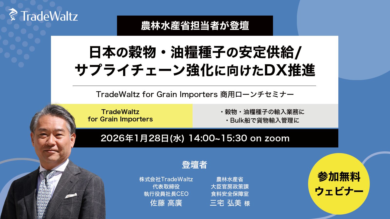 • 1月28日開催_TradeWaltz for Grain Importers 商用ローンチセミナー_ 農林水産省担当者が登壇~日本の穀物・油糧種子の安定供給/サプライチェーン強靭化に向けたDX推進~